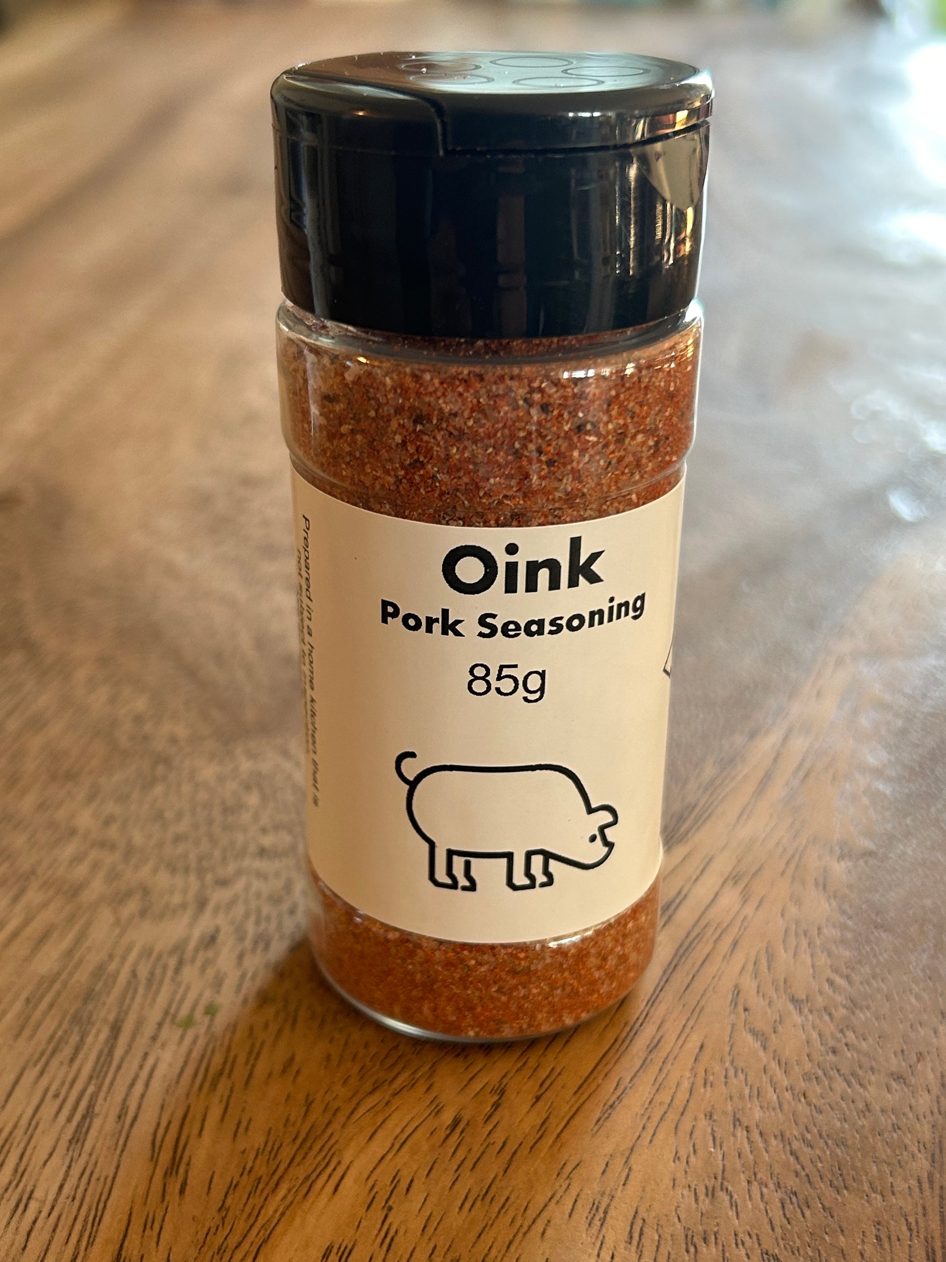Oink is a perfect blend of seasonings starring our very own homemade garlic powder. It can be used on pork tenderloins, barbecued pork chops or try it on some smoked ribs!