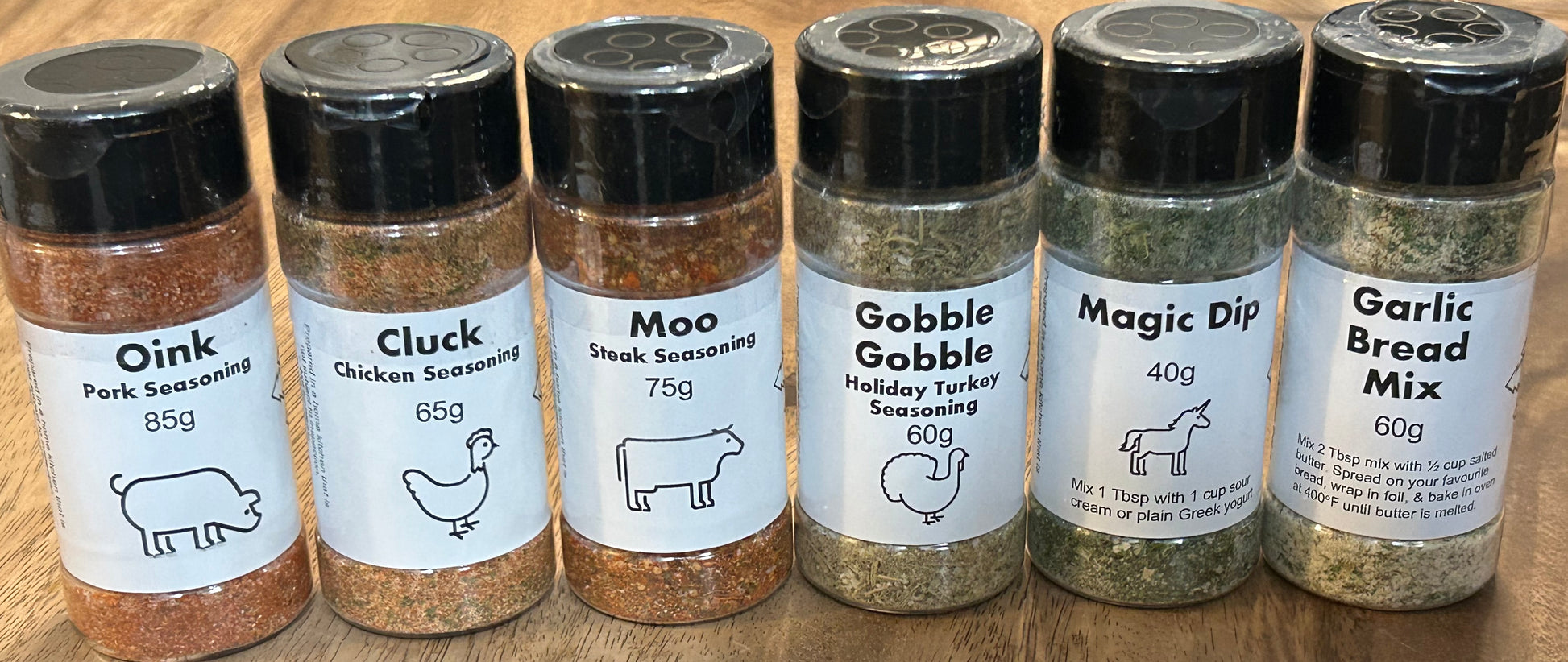 The Full Line Up Gift Pack comes with our Garlic Powder, Garlic Bread Mix, Magic Dip, Moo (Steak seasoning), Cluck (Chicken seasoning), Gobble Gobble (Turkey seasoning) and our Burger seasoning.